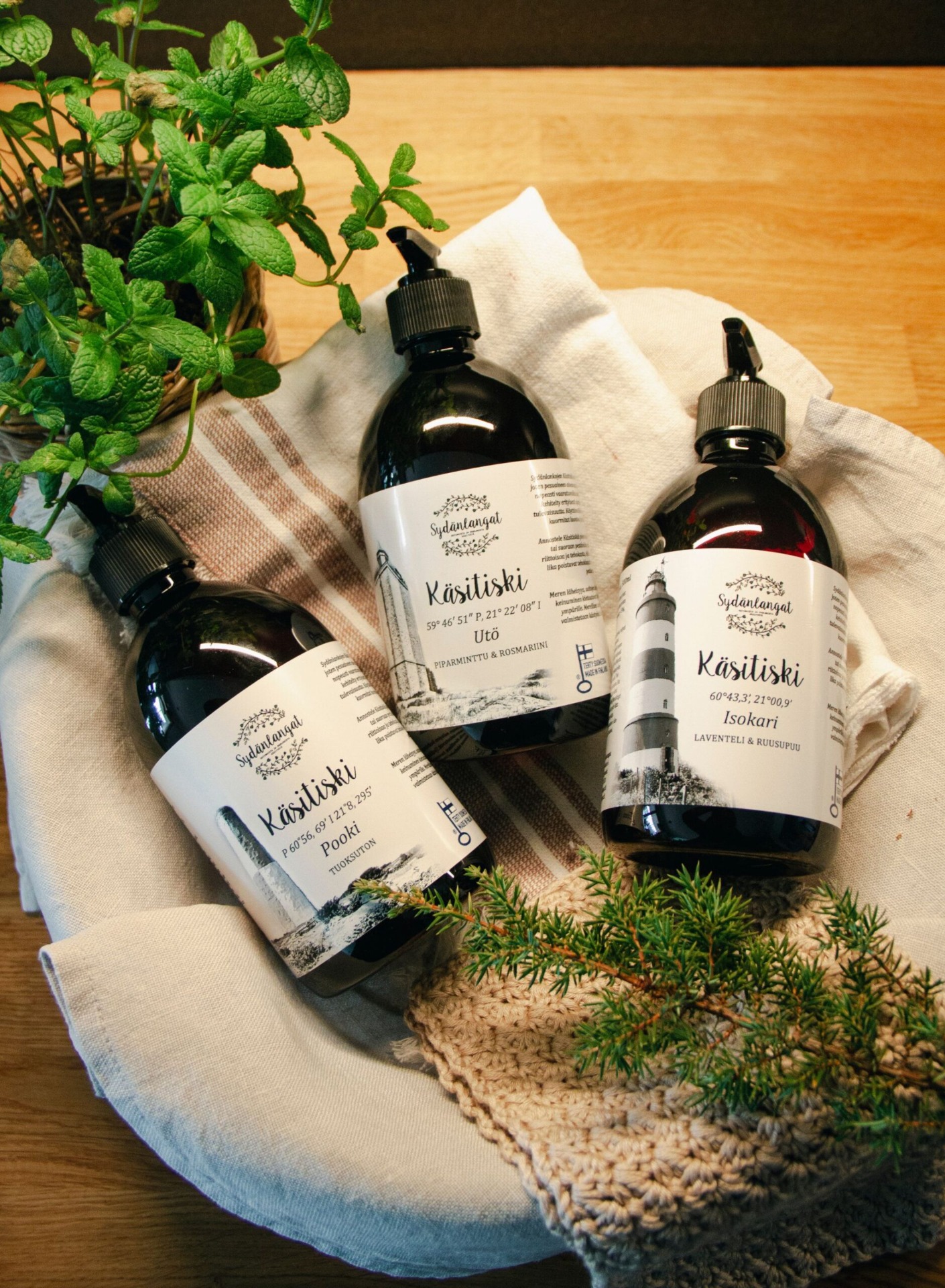 Meren läheisyys, aaltojen kohina ja niiden laineilla keinuminen kietoutuvat Sydänlankojen arvojen ympärille. Merellisen tuoteperheen Käsitiski valmistetaan käsityönä Uudessakaupungissa.