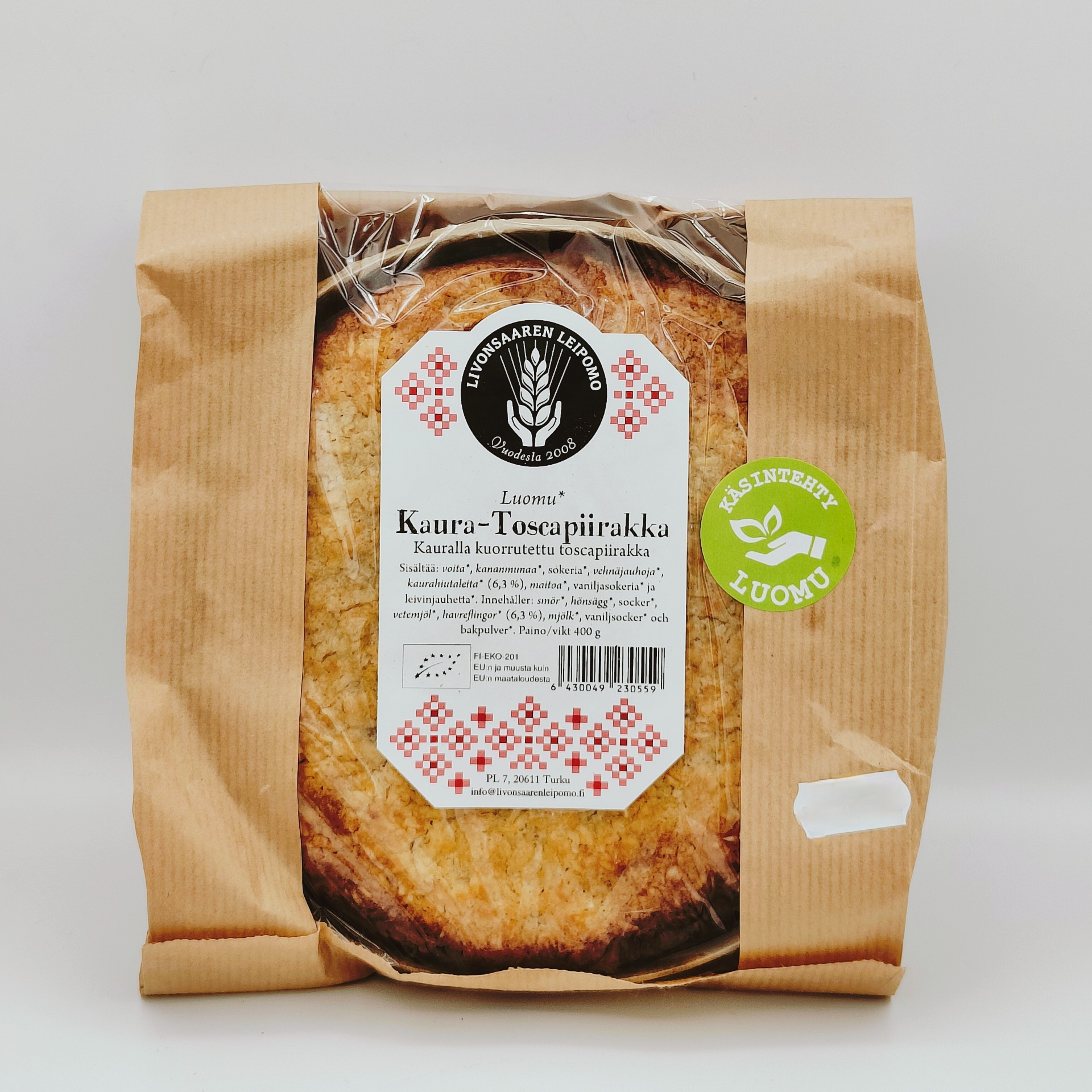 kuorrutettu toscapiirakka. Luomu*. Sisältää: voita*, kananmunaa*, sokeria*,