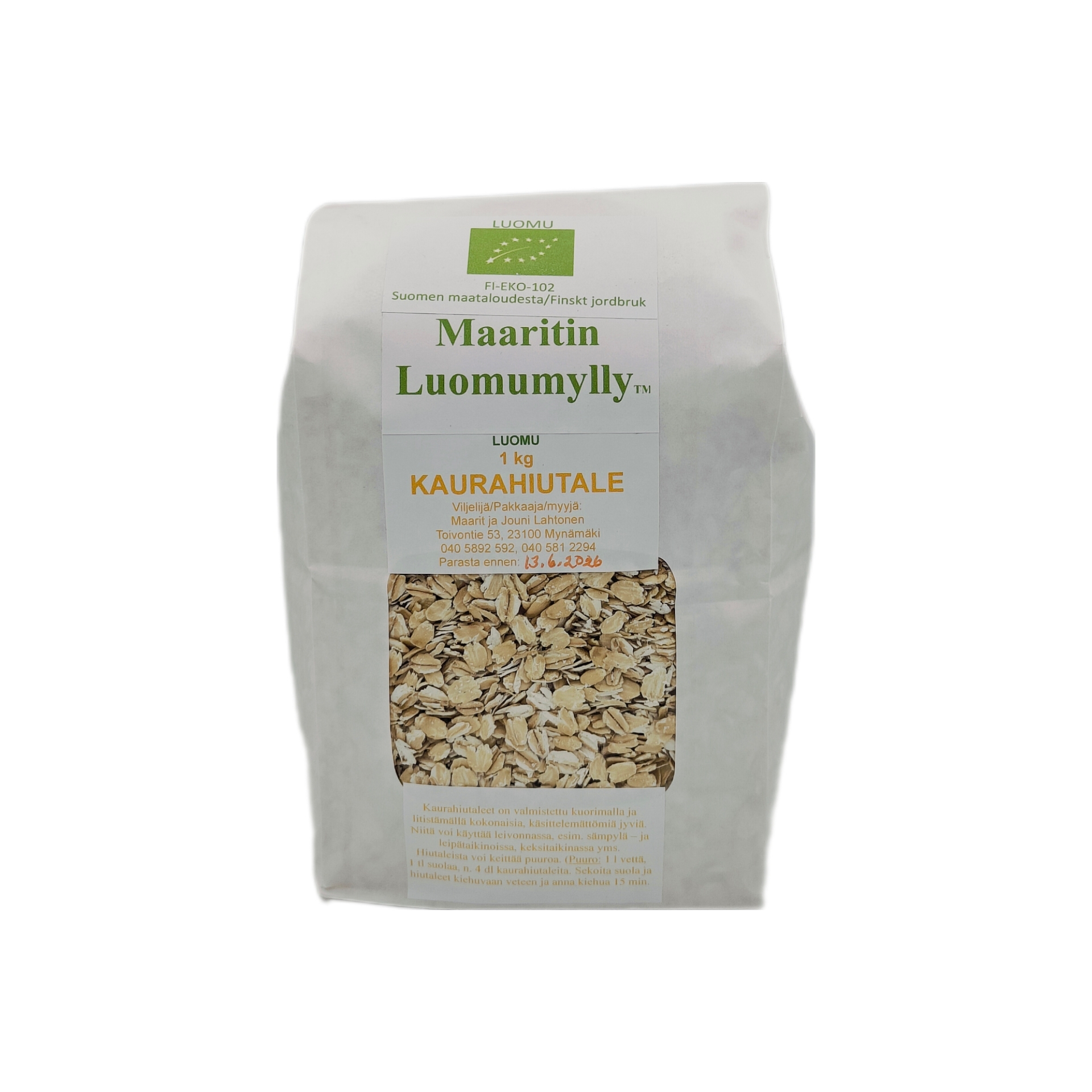 1kg luomu kaurahiutale. Saattaa sisältää jäämiä rukiista, vehnästä, speltistä ja herneestä. Kaurahiutaleet on valmistettu kuorimalla ja litistämällä kokonaisia, käsittelemättömiä jyviä. Niitä voi käyttää leivonnassa, esim. sämpylä- ja leipätaikinoissa, keksitaikinassa yms. Hiutaleista voi keittää puuroa. (Puuro: 1L vettä, 1tl suolaa, n.4dl kaurahiutaleita. Sekoita suola ja hiutaleet kiehuvaan veteen ja anna kiehua 15min.)