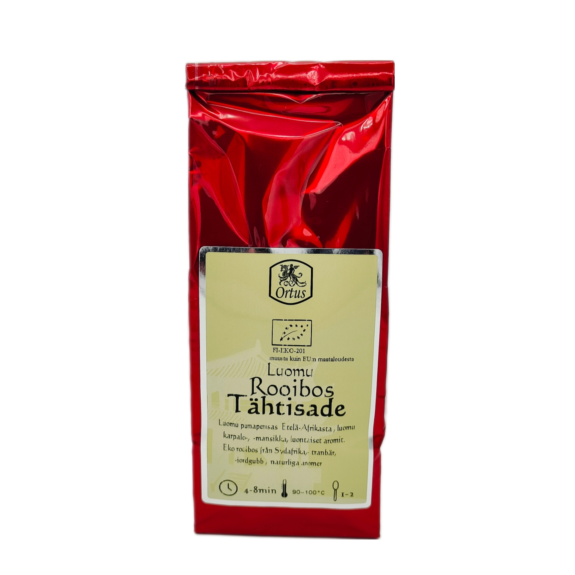 Ortus Rooibos original luomu teet valmistetaan korkealuokkaisesta Etelä-Afrikkalaisesta Super Grade laadusta. Kaikki ainesosat ovat luomulaatuisia. Rooibos on vähätanniinen ja kofeiiniton. Satokausi on kesä-syksy välisenä aikana. Rooibos sisältää C- ja E-vitamiinia. Luomu punapensas Etelä-Afrikasta, luomu karpalo-, mansikka-, luontaiset aromit. Eko rooibos från Sydafrika, tranbär-, jordgubb-, naturliga aromer.