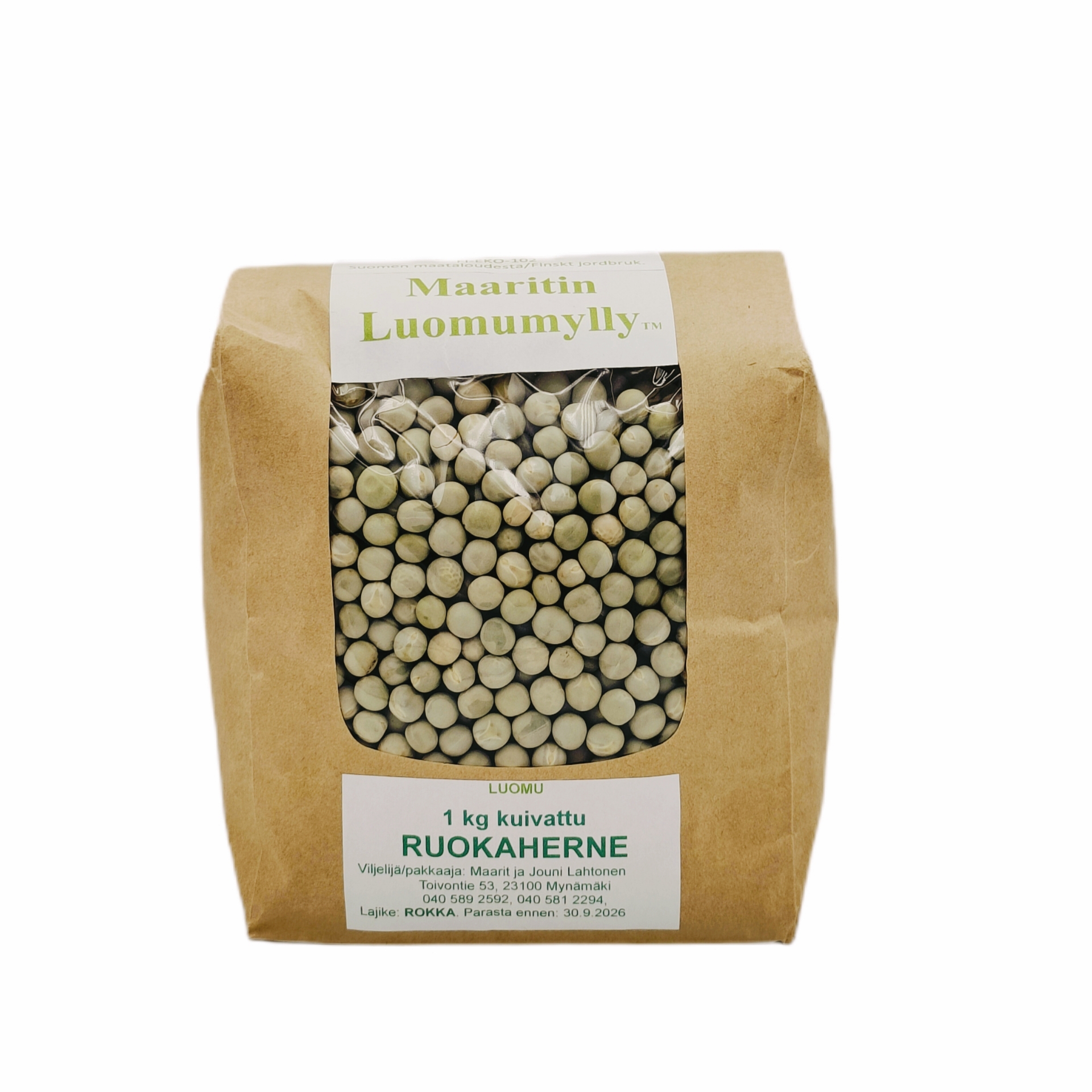 kuivattu luomu ruokaherne. Lajike: Rokka Saattaa sisältää jäämiä speltistä