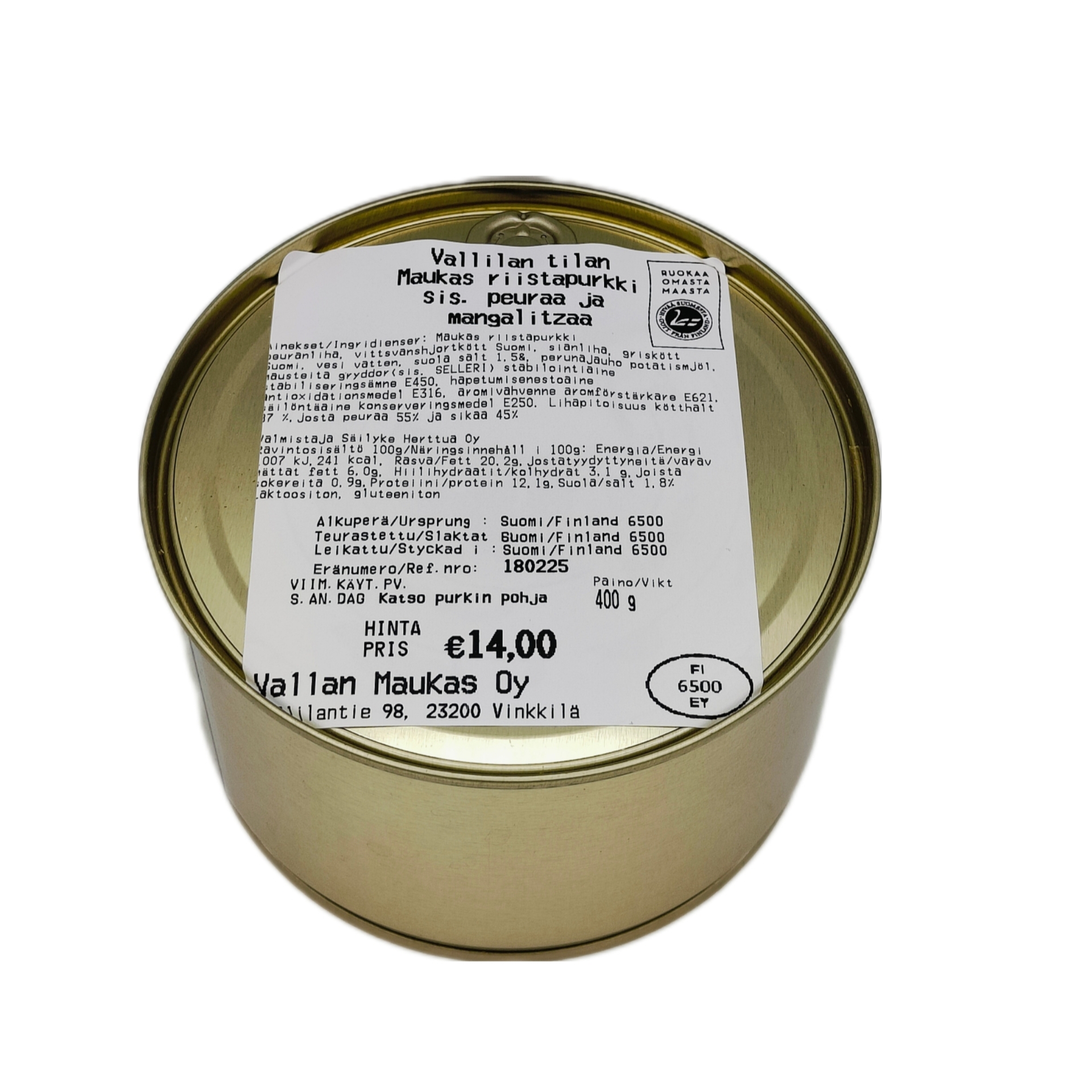 Ainekset/Ingridienser: Peuranliha/vittvanshjortkött Suomi, sianliha, griskott Suomi, vesi/vatten, suola/salt 1,5%, perunajuho/potatismjöl, mausteita/gryddor (sis. SELLERI) stabilointiaine/stabiliseringsämne 450, hapettumisenestoaine/antioxidationsmedel E316, aromivahvenne/aromförstärkare E621, Säilöntäaine/Konserveringsmedel E250, Lihapitoisuus/Kötthalt 87% josta peuraa 55% ja sikaa 45%. Valmistaja; Säilyke Herttua Oy