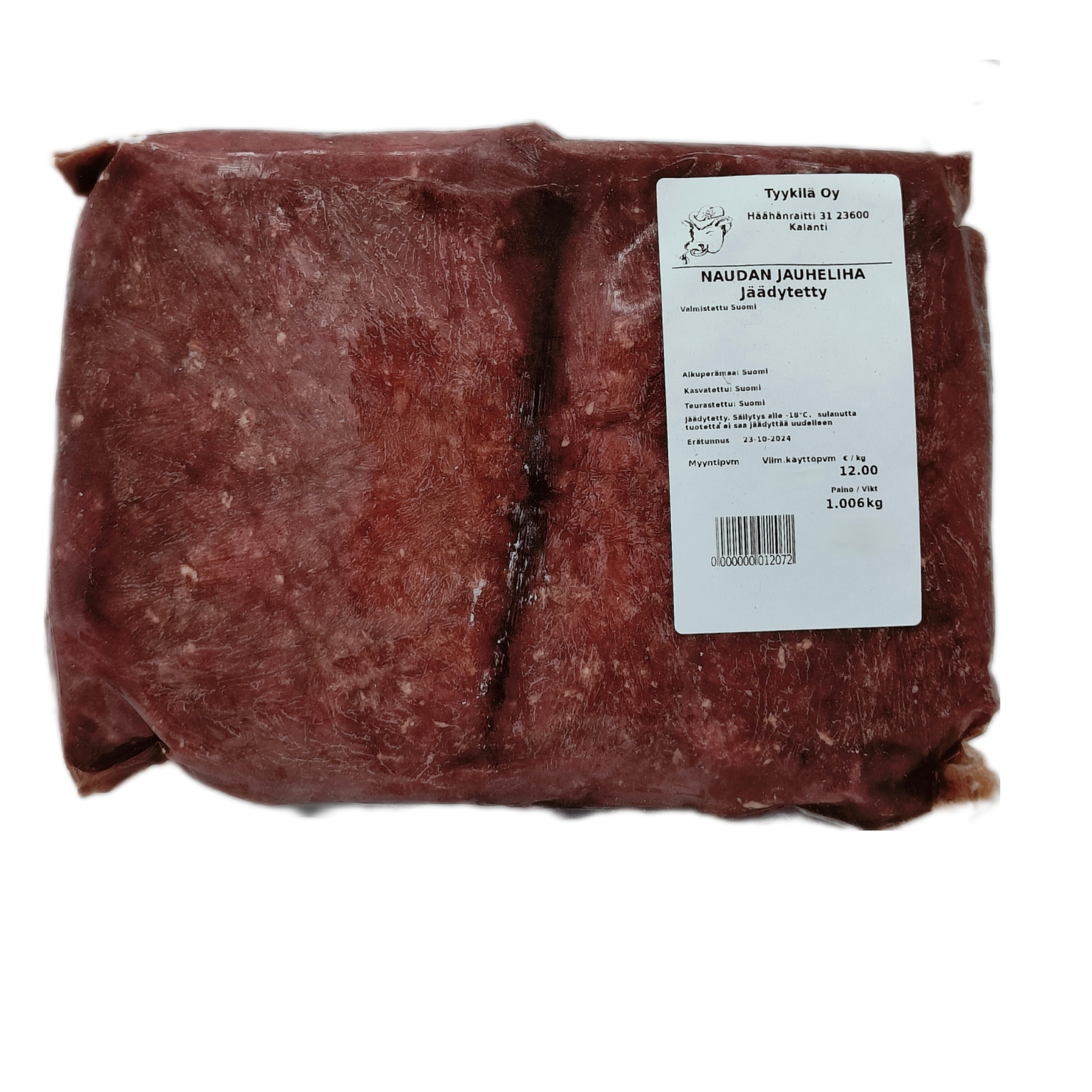 Naudan jauheliha jäädytetty. Alkuperämaa: Suomi, Kasvatettu: Suomi, Teurastettu: Suomi.